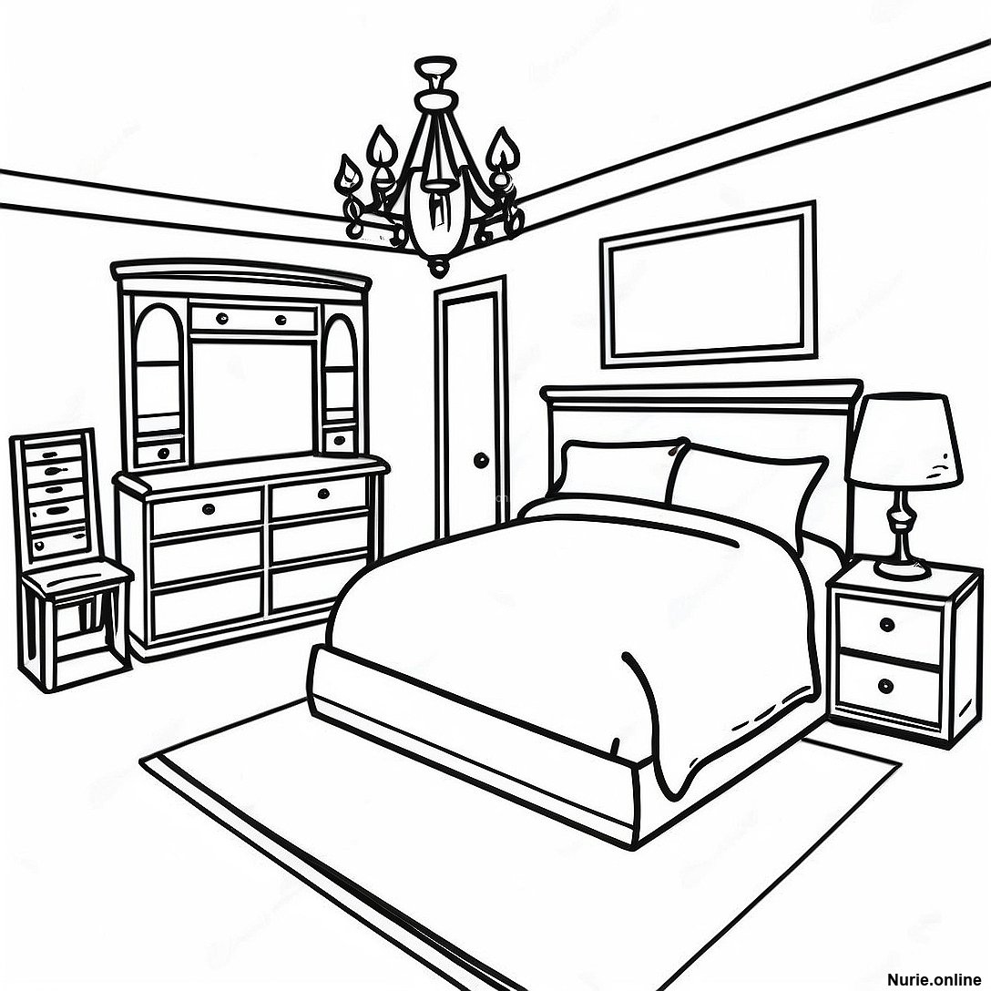 広々としたリアルな寝室の塗り絵の印刷可能なPDFをダウンロードする