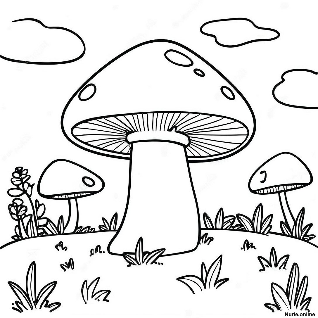 グルービーなキノコの風景の塗り絵の印刷可能なPDFをダウンロードする