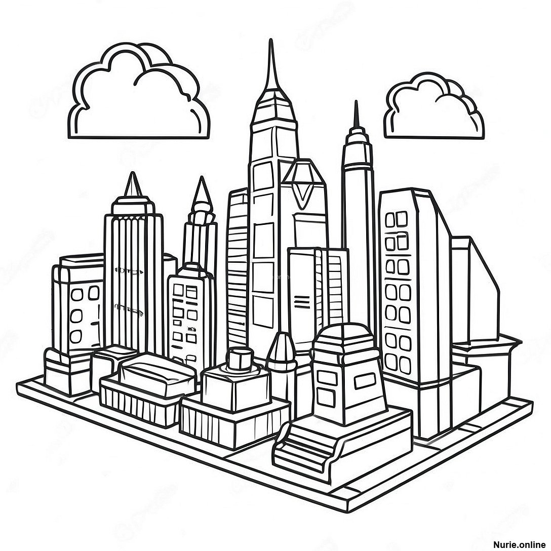 カラフルなレゴシティのスカイラインの塗り絵の印刷可能なPDFをダウンロードする