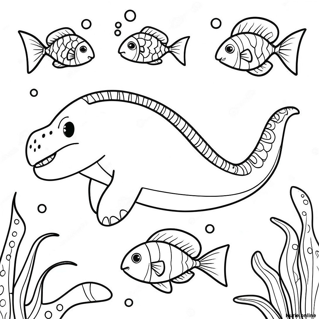 カラフルな魚と一緒のモササウルスの塗り絵の印刷可能なPDFをダウンロードする