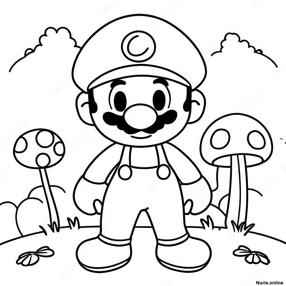 きのこを持った面白い猫マリオの塗り絵
