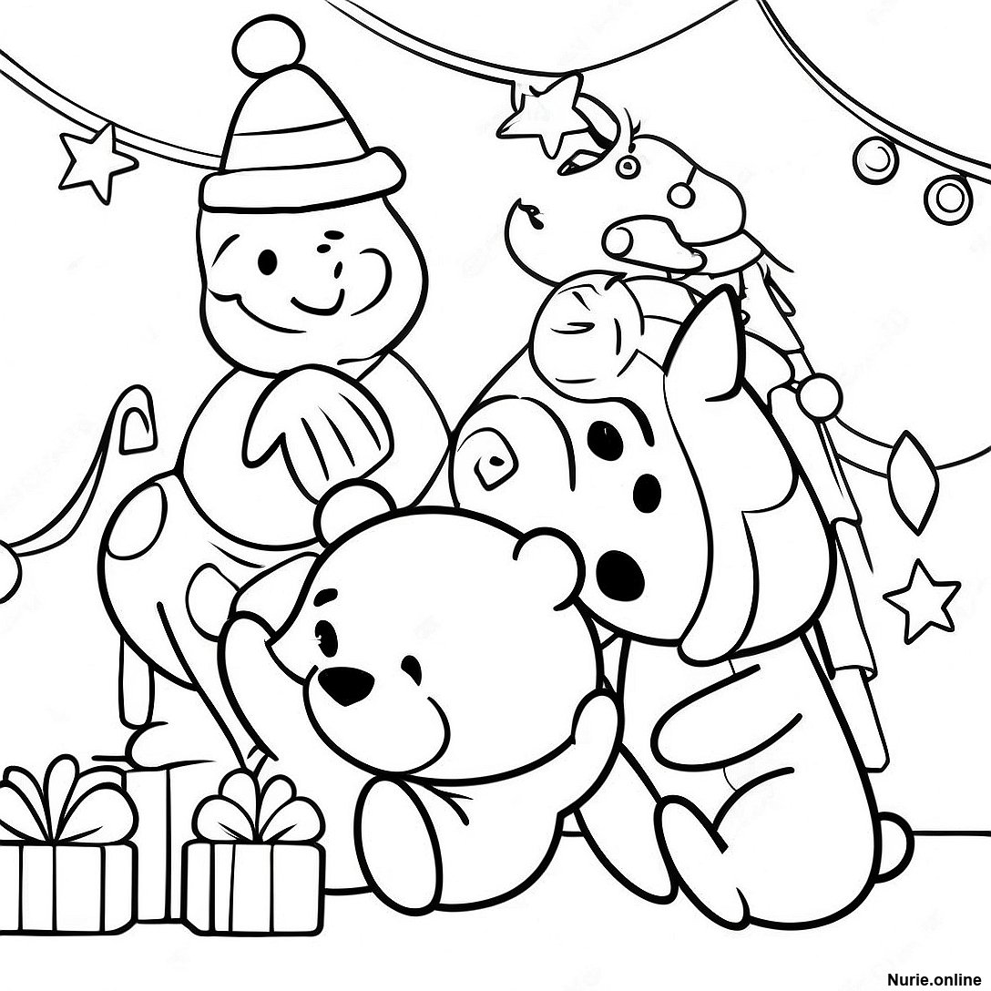 くまのプーさんと仲間たちのクリスマスのお祝いの塗り絵の印刷可能なPDFをダウンロードする