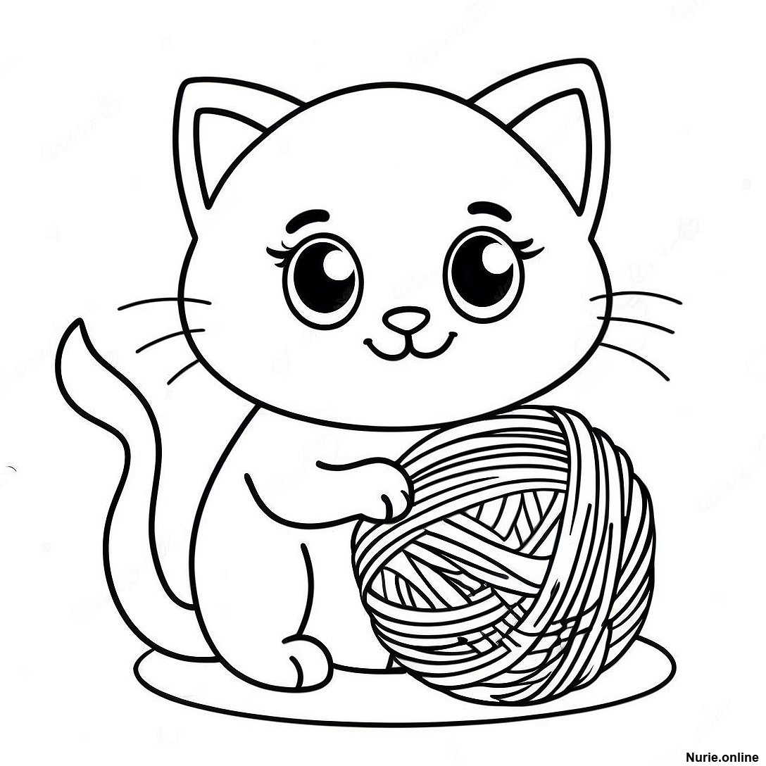 毛糸のボールで遊ぶ猫の女の子の塗り絵の印刷可能なPDFをダウンロードする