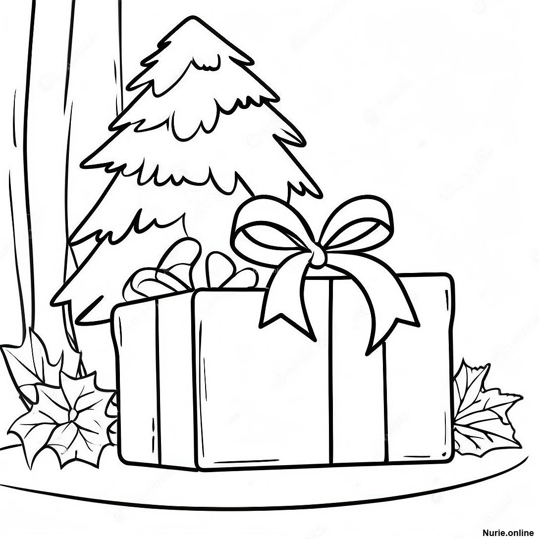 木の下の巨大なクリスマスプレゼントの塗り絵の印刷可能なPDFをダウンロードする
