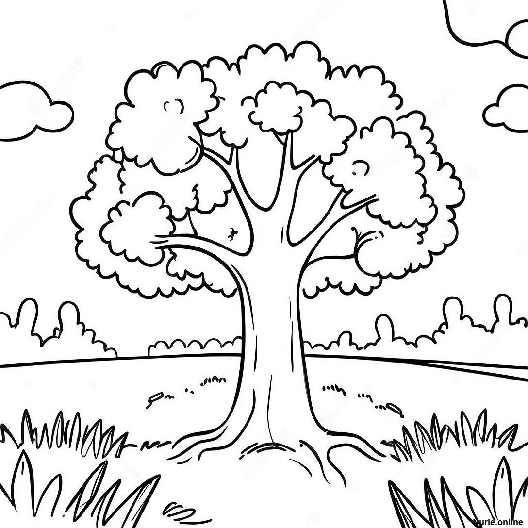 晴れた野原にある大きなリンゴの木の塗り絵の印刷可能なPDFをダウンロードする