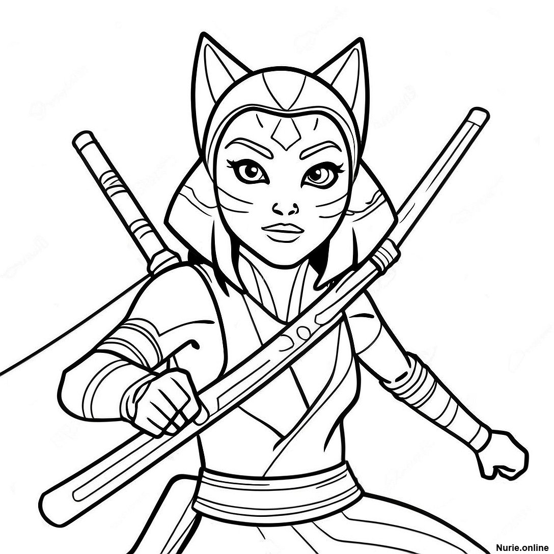 ライトセーバーを持つアソーカ・タノの塗り絵の印刷可能なPDFをダウンロードする