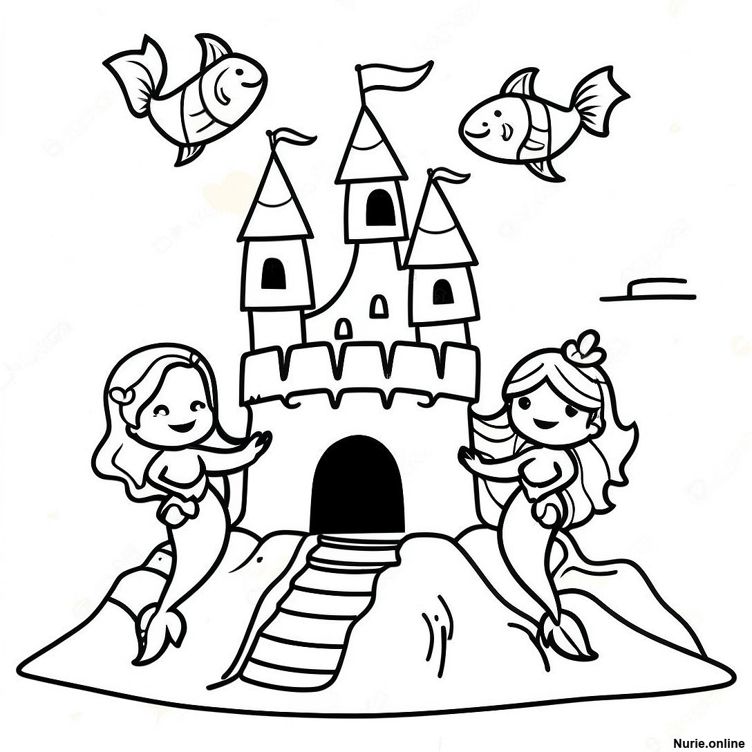 人魚のいるファンタジー砂の城 塗り絵の印刷可能なPDFをダウンロードする