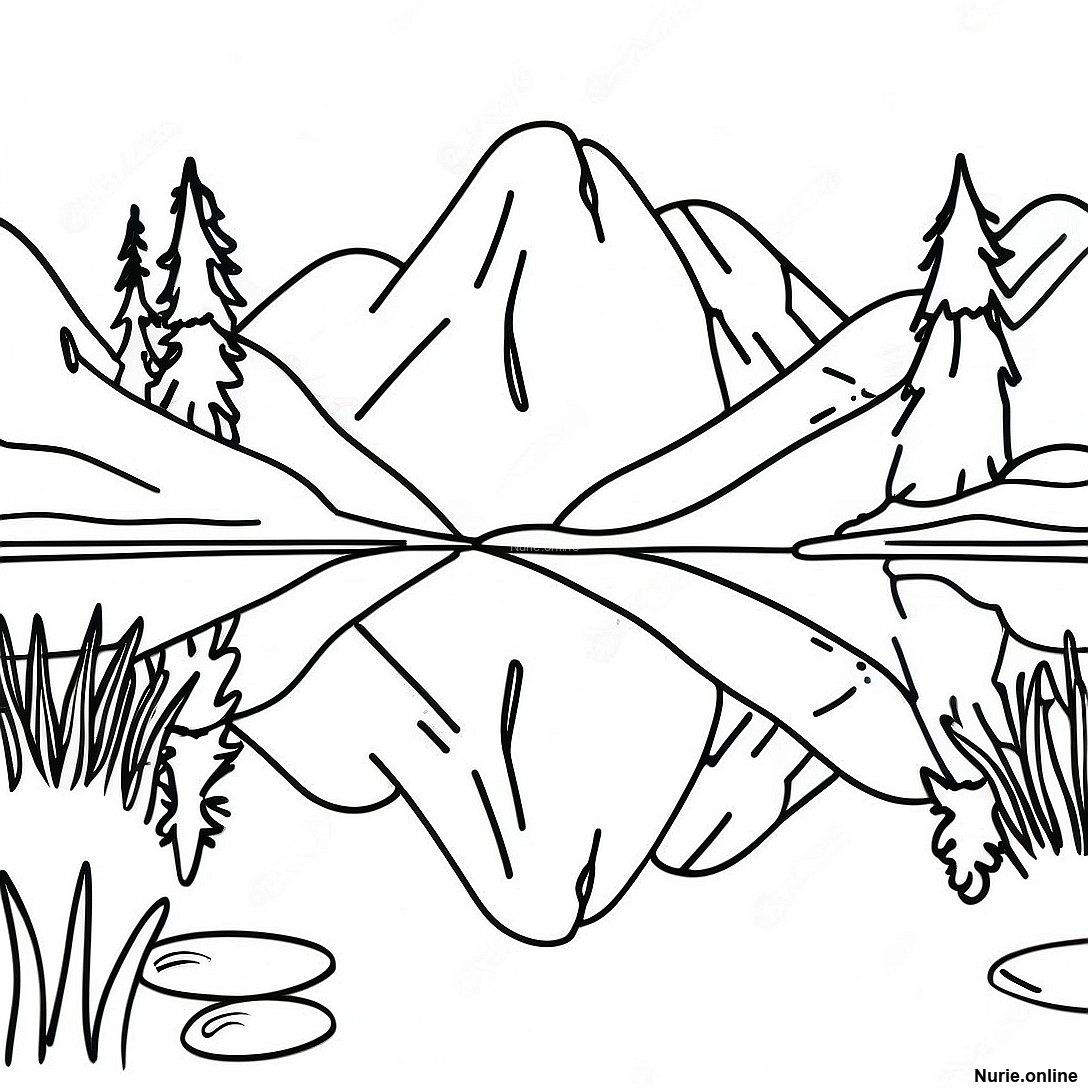 穏やかな山の湖の反射の塗り絵の印刷可能なPDFをダウンロードする