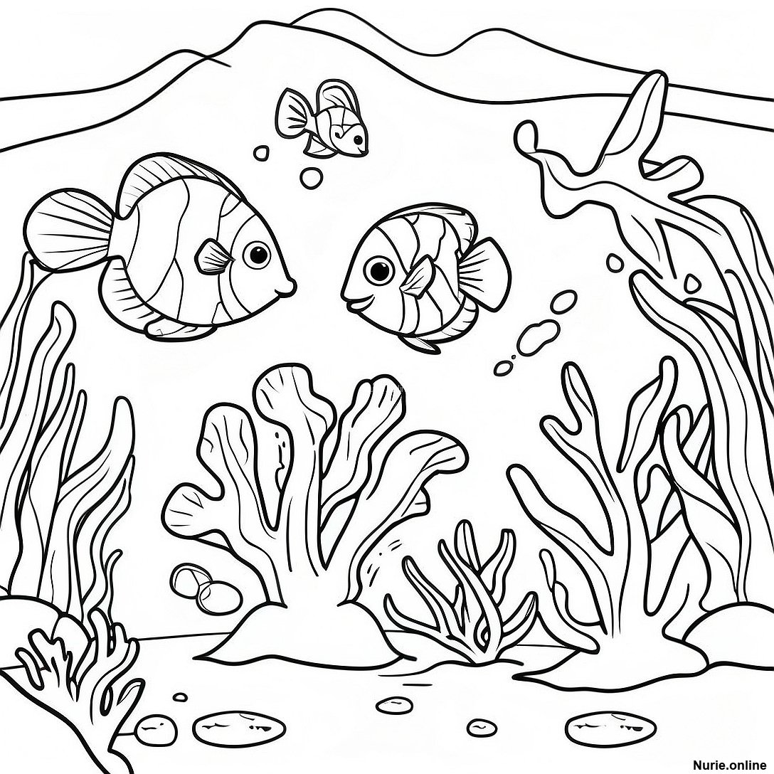 鮮やかなサンゴ礁のシーンの塗り絵の印刷可能なPDFをダウンロードする