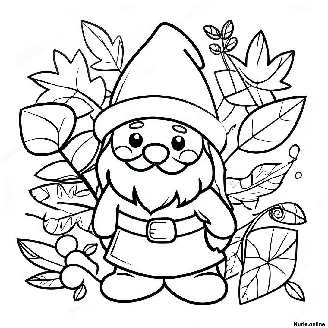 葉っぱと一緒のフェスティブな秋のノーム塗り絵の印刷可能なPDFをダウンロードする