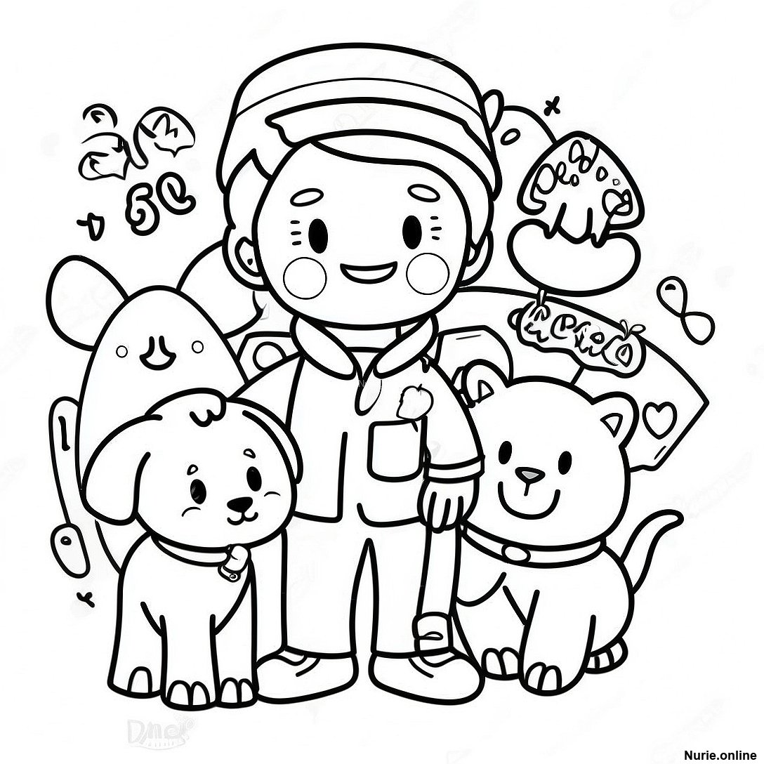 幸せな動物と獣医の塗り絵の印刷可能なPDFをダウンロードする