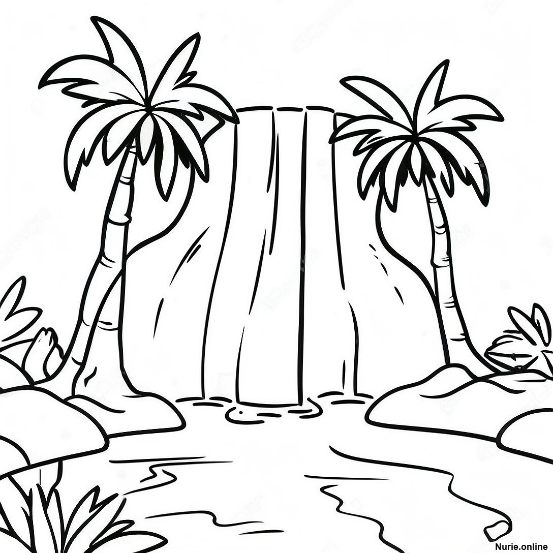 ヤシの木のあるトロピカルな滝の塗り絵の印刷可能なPDFをダウンロードする