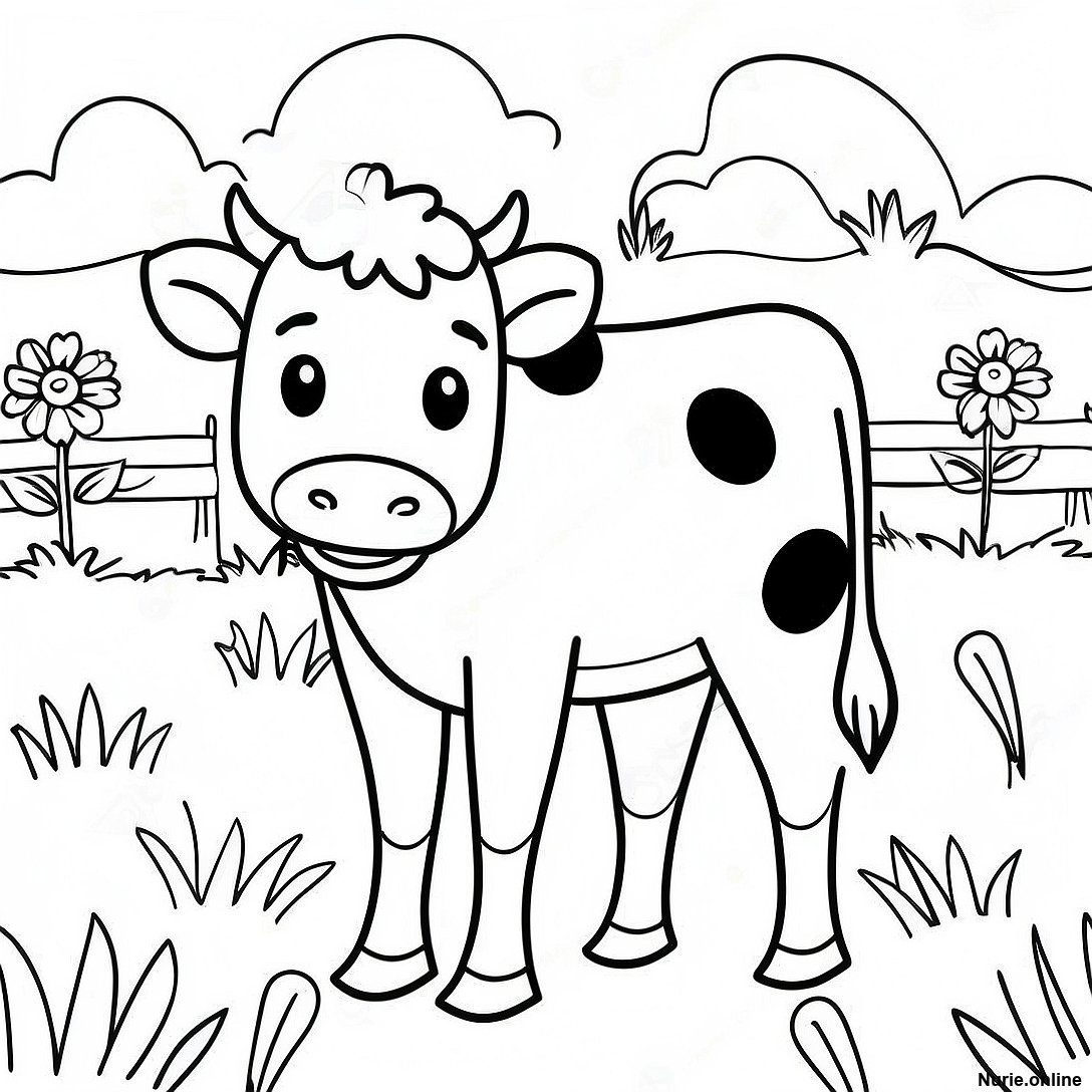 野原で草を食べる幸せな牛の塗り絵の印刷可能なPDFをダウンロードする